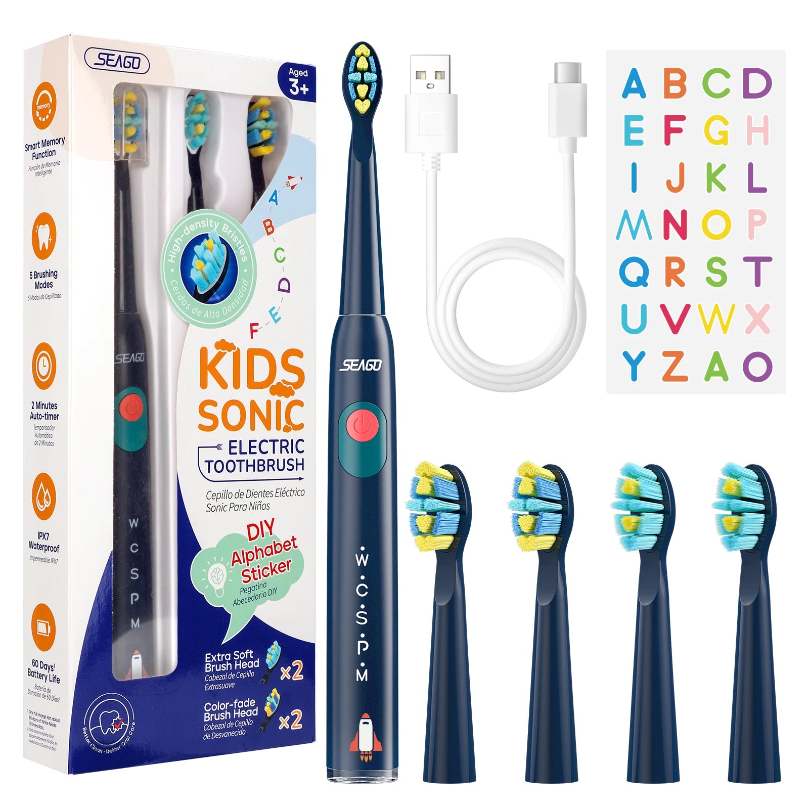 Seago Kids Electric Toothbrush for 6+Years 5 Modes Rechargeable IPX7 Waterproof Power Sonic Toothbrush Replacement Head SG-2303